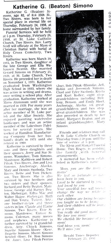 Bette Simono at home; three sons, Jerry of Madison, Thomas of Manitowoc and