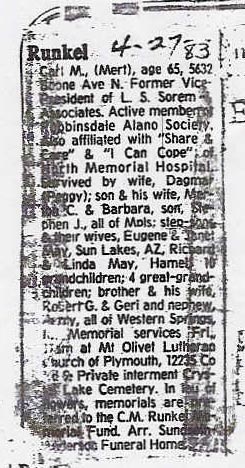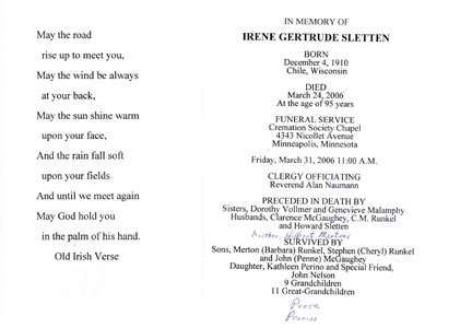 Sletten, Irene Runkel of Minneapolis, 95, died March 24, 2006. A memorial service