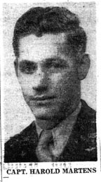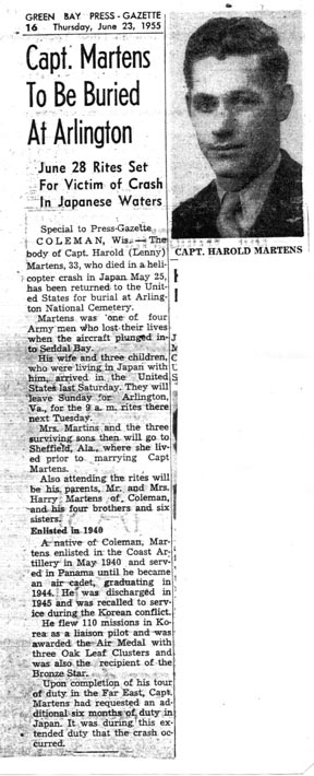 Times June 23, 1955 Thursday, Page 1 Capt. Martens To Coleman - Word has been received that the remains of Capt. Harry (Lenny) Martens, 34, who was killed in a helicopter accident in Sendai Bay in Japan will be buried in Arlington Cemetery, Arlington, VA., on June 28 at 9:00 a.m. He is the son of Postmaster and Mrs. Harry Martens of Coleman. His wife and three sons arrived in the United States from Japan Saturday. After clearance, they flew to Chicago arriving there Tuesday, and they came to Coleman Wednesday evening. Mrs. Martens is the former Frances King of Sheffield, Ala., and their sons are Richard, 6 Michael, 5 and Robert, 4. After the funeral service, she and the children will live in Sheffield. Additional survivors besides the parents are four brothers and six sisters. Members of the Martens family will accompany the deceased's wife to Arlington, Va., for burial ceremonies. A native of Coleman, Capt. Martens enlisted in the Coast Artillery on May 26, 1940, and after basic training was sent to Panama. He became a U.S. Army Air Cadet in 1943 and graduated as a second lieutenant on Feb. 22, 1944. In 1945 he was discharged and entered the organized army reserves. For several years, he was employed in Green Bay until the start of the Korean war when he was recalled back into the service, as a second lieutenant in the infantry. Later he was admitted to the Army Cadet School at Fort Sill, Okla., and received his wings in 1952. Sent to Korea, he completed 110 missions as a liason officer pilot. He received the Air Medal with three oak leaf clusters and the Bronze Star. He was eligible to return to the United States last December but requsted six more months of duty in Japan. His present tour of duty would have ended on July 15. |