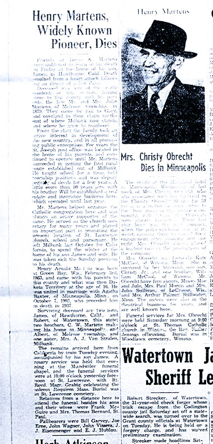 Mrs. H. A. Martens, a resident of Milbank for the past 34 years, died Monday