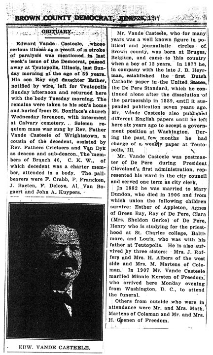 Raymond Vande Casteele was born at De Pere August 31, 1886. He died August