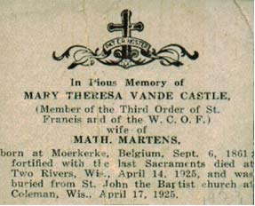 DePere, Wisconsin * Maria Teresa Van De Wiele b. May 9, 1828 Moerkerke, Belgium