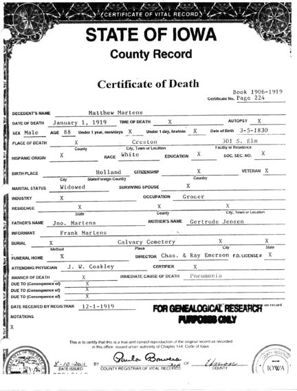 1, 1919 in Creston, Iowa. Spouse: Johanna b.1842 in Holland m. Abt. 1870 Children: