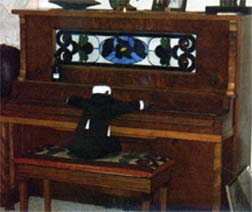 glass and the needlepoint Bench cover. The piano now sits in our living room