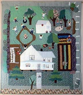 A Summers Day - Martens Family Heritage Quilt - 62" x 53". Depicts the Laurence Martens home, children and neighbors on a typical summer's day in the early 1960's. Mom is on the quilt at the front door holding Eddie and also hanging laundry. She said that if I ever did a quilt, I had to have her doing laundry as she spent most of her life hanging diapers. And, Mom always had to be in two places at one time. The quilt is filled with my memories and each has a wonderful story. I, too, am on the quilt twice (artist's liberty). I am playing marbles with my dog, Red, and also playing kick ball, one of our favorite pastimes. |