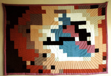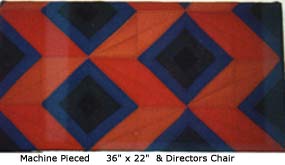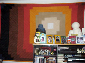 ![]() Machine Pieced 4" squares, hand quilted large wall quilt entitled "Implosion". I was experimenting with color weight. Hand quilting begins with a small circle in the center of the white square with diagonal radiating "v" shape line going in each direction of the quilt design. |
