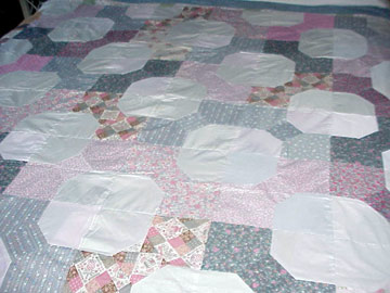 This quilt was started at that time for my GodChild Andrea. I would work on this while the students were sewing their projects unless they needed help. When the borders are added, the quilt will fit a queen size bed and is designed to be used as a bed quilt. My GodChild is now much older, has a home of her own and her room is no longer pink and gray. This project will be completed this year, however, and it is for her if she wants it. Quilt is Machine Pieced but will be hand quilted. |