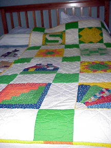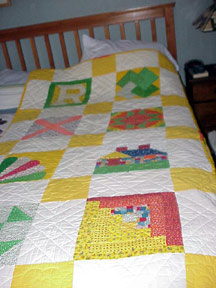 Hand Pieced and Quilted Bunk size quilts for each of my daughters. Pillow Shams also quilted with two additional blocks (Not Shown). Each quilt has one square that was chosen as the name of the block applied to the nature of each daughter. This project was started as a result of the only quilt class I ever took thru our park district. |