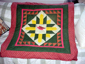 ![]() 36" hand pieced and hand quilted center square for a Wisconsin quilt based on an article in Quilter's Newletter magazine on the quilt blocks that were created in Wisconsin (I have misplaced this magazine and would love a copy of the article to finish the project, if anyone can locate for me Kathy. Block name is eitehr Bird in Meadow or Lark in Meadow. |